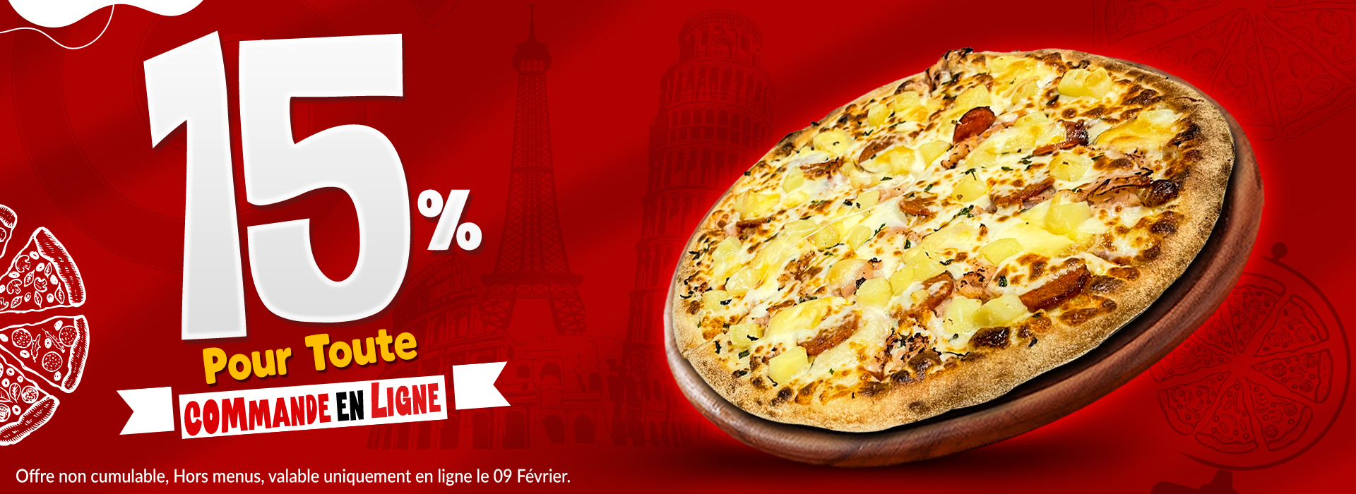 Toutes nos offres, coupons et codes promotionnels ne sont pas cumulables avec les menus, les SMS, les pizzas moitié-moitié ou autres offres en cours.
